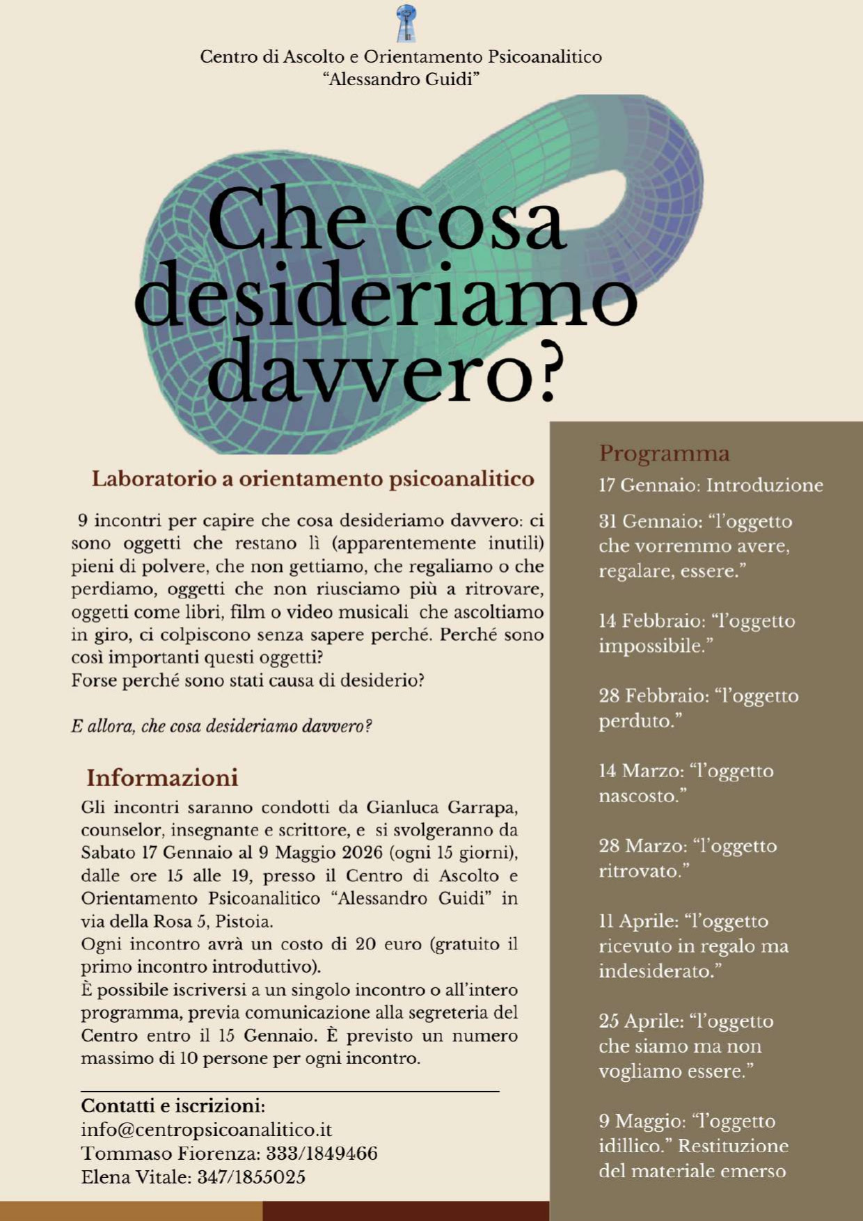 Gli incontri saranno condotti da Gianluca Garrapa, counselor, insegnante e scrittore, e si svolgeranno da Sabato 17 Gennaio al 9 Maggio 2026 (ogni 15 giorni), dalle ore 15 alle 19, presso il Centro di Ascolto e Orientamento Psicoanalitico “Alessandro Guidi” in via della Rosa 5, Pistoia.